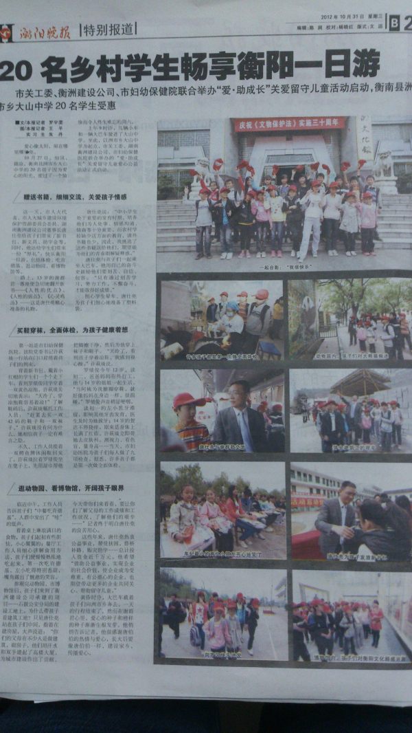 10月27日,由市關(guān)工委牽頭組織、我司承辦的關(guān)愛留守兒童愛心活動在衡陽市婦幼保健院舉行,活動組織了來自衡南縣的20留守兒童代表參加,我司向這些留守兒童捐贈了書包、字典等文具,中午安排他們在肯德基就餐,餐后帶領(lǐng)他們先后游覽了衡陽市動物園、衡陽市博物館,最后到達(dá)我司承建的石鼓公安分局業(yè)務(wù)用房項目參觀。